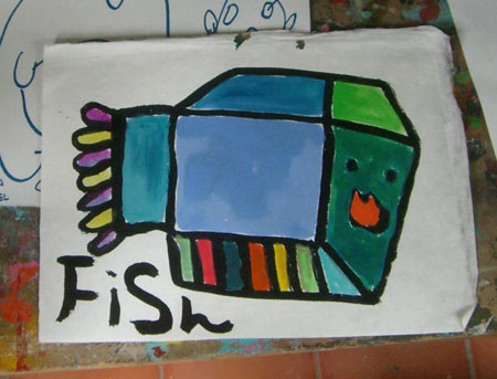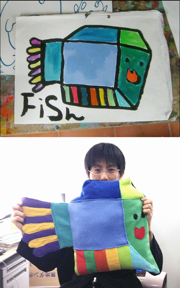 前に当選した、「描いた絵がぬいぐるみになるサービス」で 商品が届きました。僕の書いた魚が ぬいぐるみに!